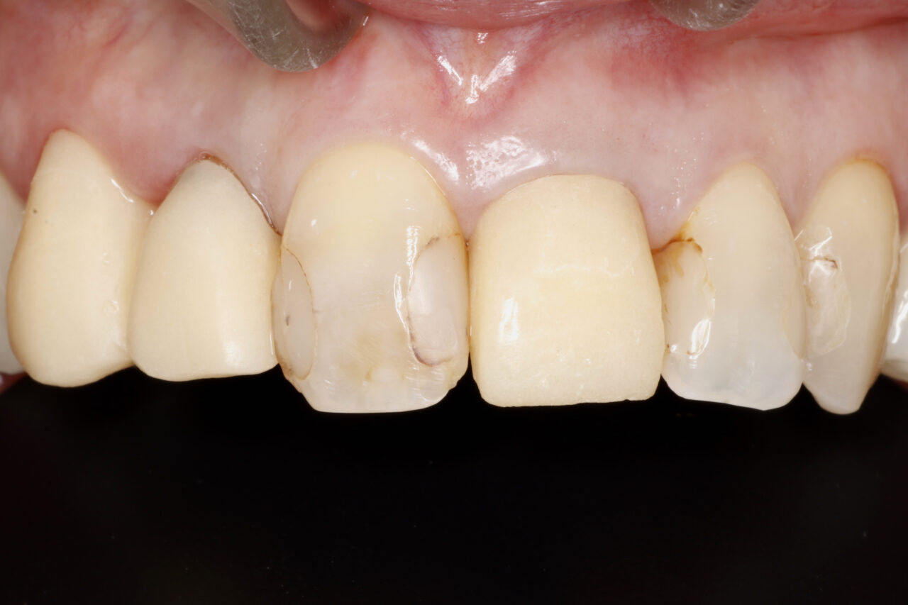 前歯の補綴物に経年劣化や色調の不調和が見られ、見た目の違和感が気になる状態です。